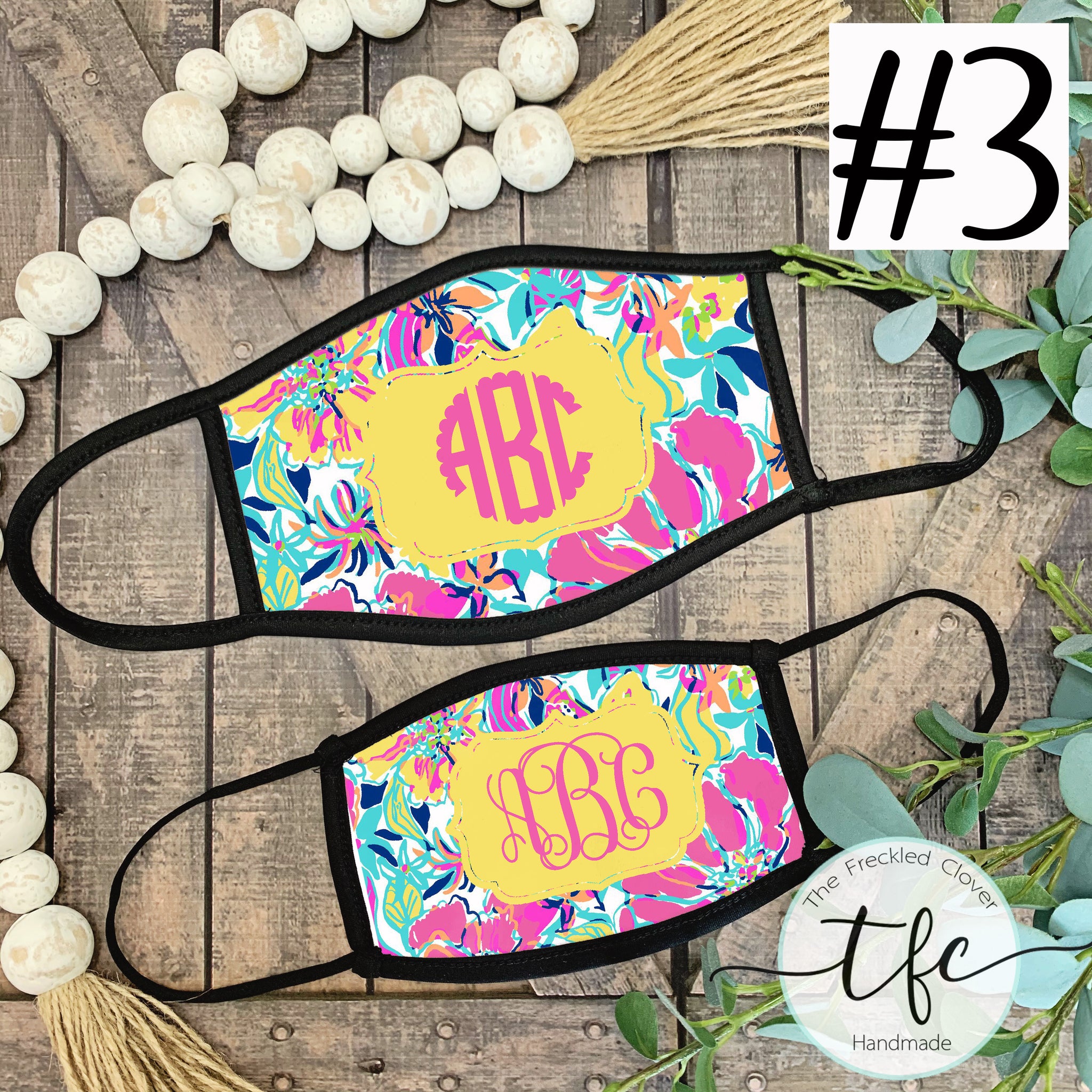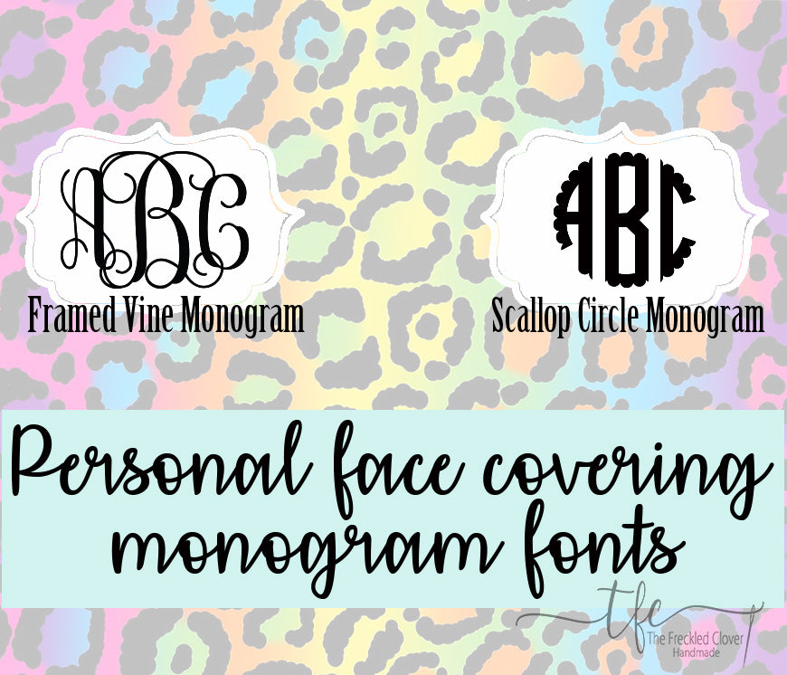 You may add a monogram to your mask.  We have two monogram styles- Vine and Scallop.  When leaving your monogram, please leave it in the following format: